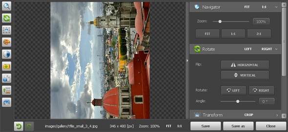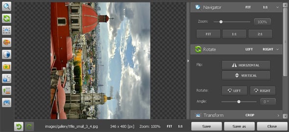 The right control panel of the Image Editor offers the set of options and tools for the advanced, effective and fast image editing. By means of the left toolbar you can quickly access the Image Editor’s functions.