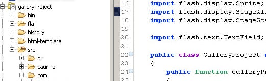 Let’s create class called Gallery.as in the src/com/flashmoto/gallery folder. At first it will look this way.