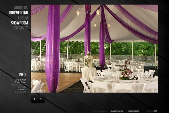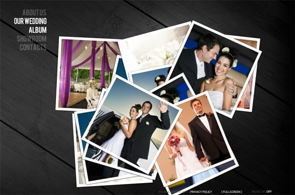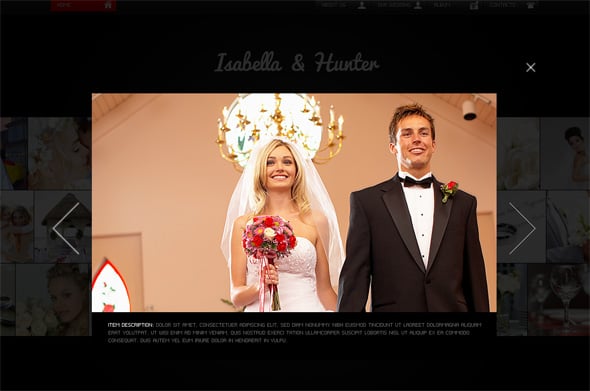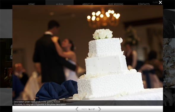 The photo gallery will present your wedding photos in a creative way: the images are thrown on a dark background what creates a great visual impression on visitors. Click any image to zoom in and see the photo of the original size.