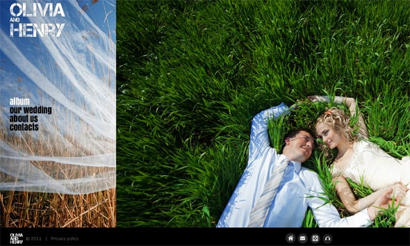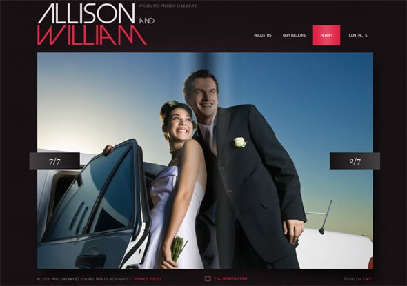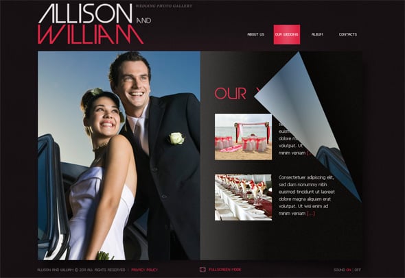 This attractive wedding Flash website is peculiar for the amazing gallery previews that easily run when you point the mouse over them. Bright interactive elements on a dark background create an unforgettable impression on visitors.