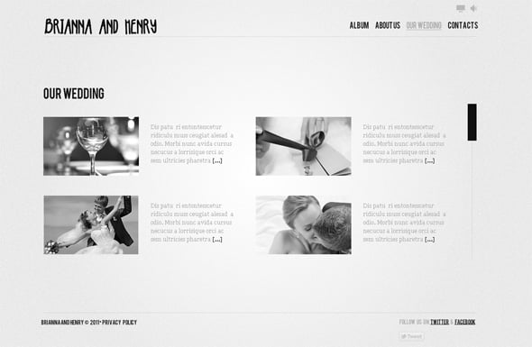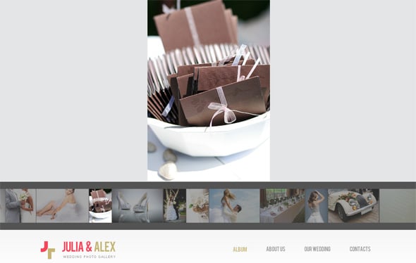 This neat stylish design may become a fantastic choice for a wedding album or a wedding photographer’s portfolio. The unusual image gallery with vertical scrolling and intuitive navigation allows the visitors to view the photos in a simple convenient way.