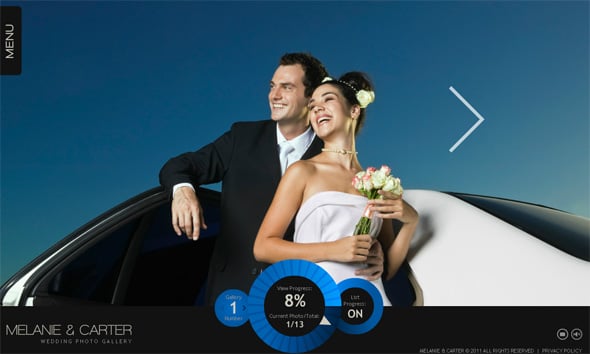 This wedding gallery creates a fullscreen gallery of your precious photos and gives the viewers a chance to examine every single detail of your works. A simple yet stylish menu will help your website visitors to easily navigate the album.