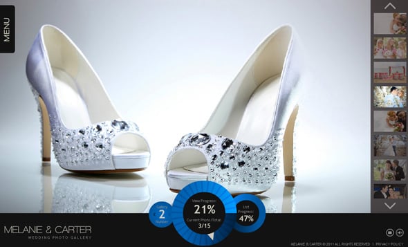 This gorgeous gallery is definitely one of the most stylish, original and highly functional solutions in the niche. There is a progress indicator that shows the number of the gallery you are looking through, the number of the current photo as well as the thumbnail gallery progress. A pretty interesting design solution.
