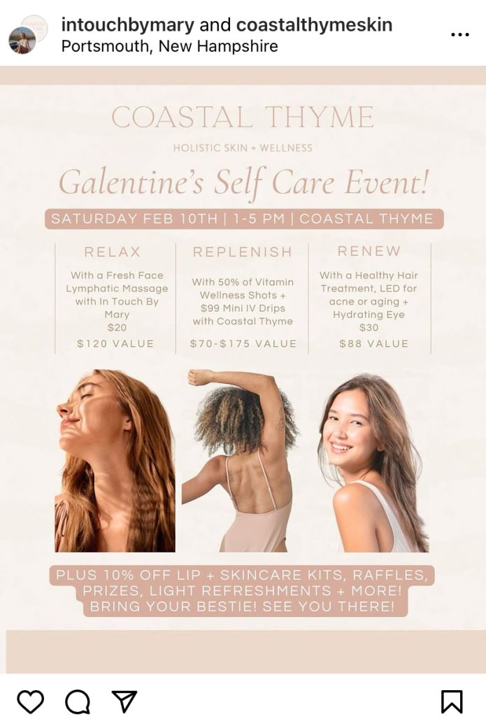 You can work with complementary brands by exchanging referrals or leads. You can also create joint offers or product bundles— be sure to discuss how profits from these collaborations are shared. For example, In Touch by Mary is a massage therapy brand, and Coastal Thyme is a wellness clinic. So, they collaborate to create the service bundle that you see in the image below: