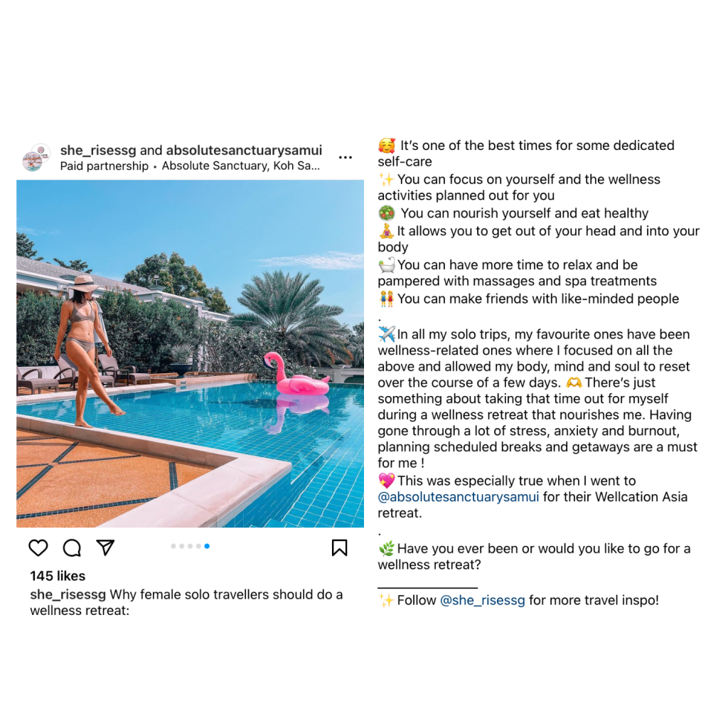 You can also work with influencers by sponsoring content— blog posts, social media posts, or podcasts, where they recommend or talk about your product or services. The example below is a paid partnership between the wellness resort Absolute Sanctus and wellness travel influencer @sherisessg: