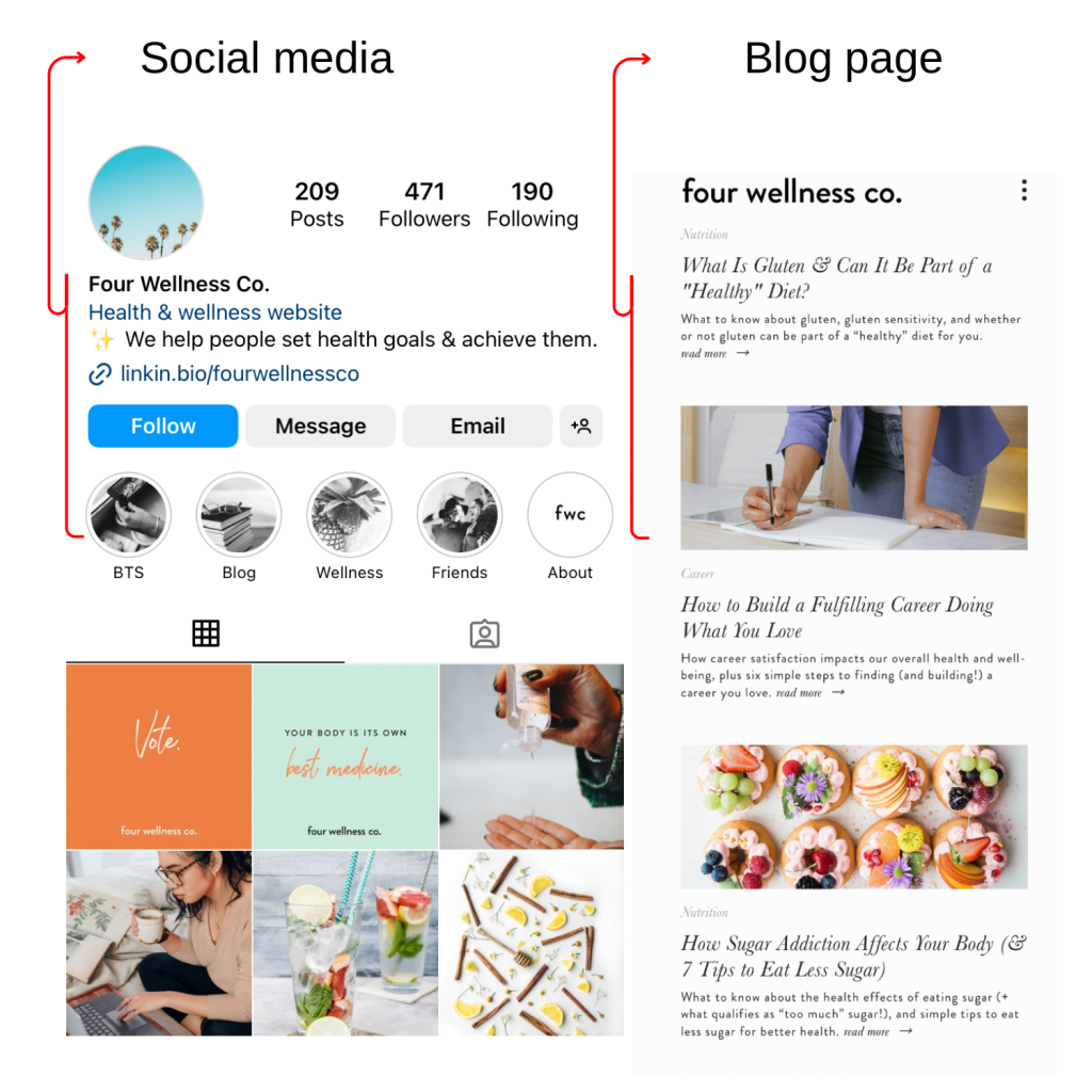 The strategy is to share valuable content with your target market online– this content can be entertaining, educational, or informative. Like the Four Wellness Co. below, you can have a blog and social media page to share quality content with your target audience.
