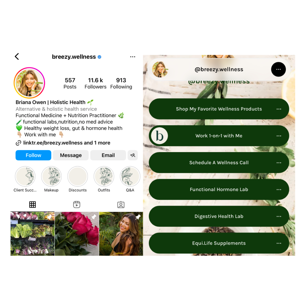 Once you have an attractive landing page, use other digital channels, such as social media, online directories, or external websites, to attract attention and direct prospects to it. See how Briana Owens uses her Instagram profile to promote multiple landing pages for her wellness products and services.