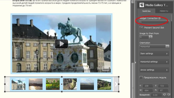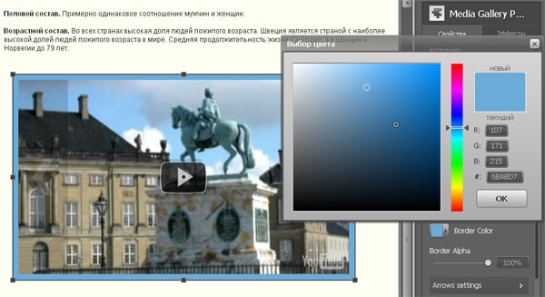 В панели справа общие настройки модуля. Вы можете создать слайд-шоу, изменить внешний вид рамки галереи и навигационных кнопок и многое другое. Мы просто изменим цвет рамки видеопроигрывателя.