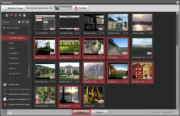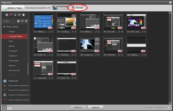 Мы будем наполнять галерею видео роликами с сайта YouTube.com. В Медиатеке нажимаем кнопку с логотипом YouTube.
