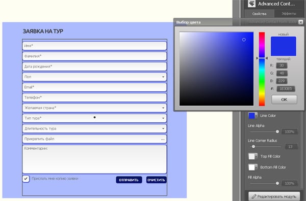 Важным дополнением данного модуля являются возможность создания дизайна формы. Вы можете задать необходимые цвета для фона, полей и кнопок, изменить форму полей, применить различные эффекты.