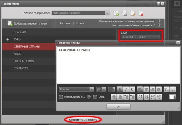 Дважды нажимаем на изображение меню и видим список пунктов меню. Переименовываем пункты и указываем на какие страницы они должны вести при нажатии.