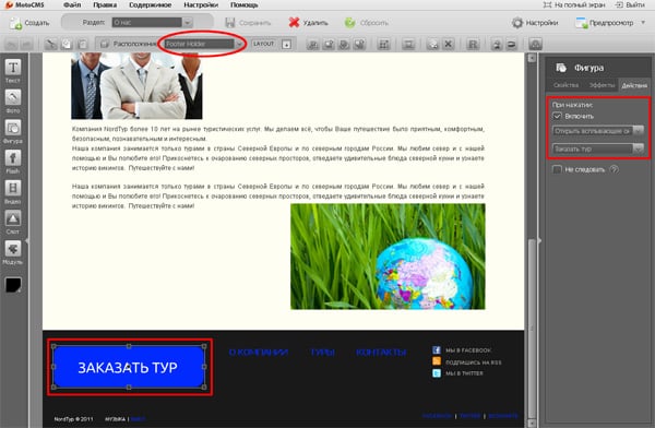 Теперь нам необходимо создать кнопку, при нажатии на которую будет открываться всплывающее окно с формой заказа тура. Мы размещаем кнопку в футере, для того, чтобы заказать услугу можно было с любой страницы сайта. Обратите внимание, что кнопку необходимо разместить в Foooter Holder. Также в правой панели переходим на вкладку «Действия» и указываем, что при нажатии на кнопку должно открываться высплывающее окно с нашей формой заказа.