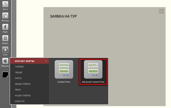 Выбираем модуль Advanced Contact Form и размещаем его в нашем всплывающем окне.