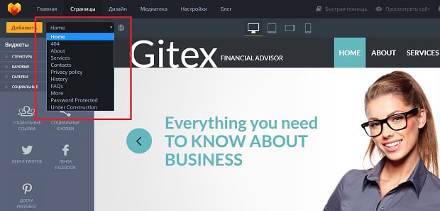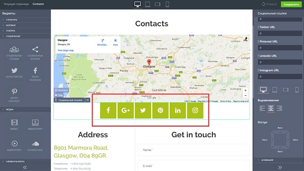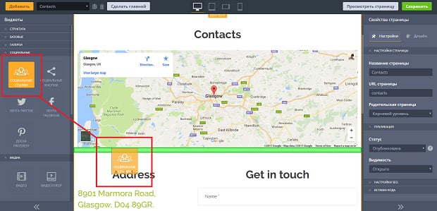 Как быть, если вы хотите добавить к себе на страницу кнопки социальных сетей? Вы просто находите соответствующий виджет и перетаскиваете его на нужное место.
