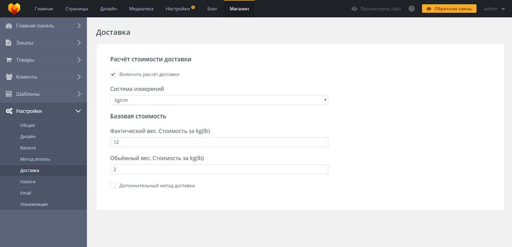 Первое улучшение в данном обновлении, о котором стоит упомянуть, – это функция расчета стоимости доставки. Чтобы настроить расчет доставки, перейдите на вкладку «Настройки» вашего интернет-магазина от MotoCMS. Во-первых, вы должны установить соответствующий флажок для того, чтобы включить расчёт доставки. После этого перед вами появятся такие настройки как Система измерений и Базовая стоимость.