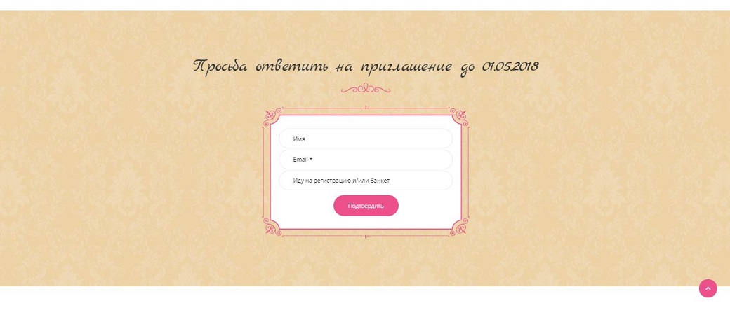 Встроенный виджет контактной формы поможет гостям сразу же ответить на ваше приглашение. Таким образом, вы заранее будете знать, кто захочет разделить с вами счастливое событие. Это очень удобно — вы получите все ответы на свой e-mail и при необходимости сможете рассказать гостям подробности уже в личной переписке.