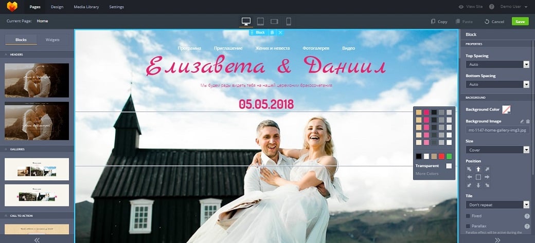 Выбрав шаблон, можете смело приступать к его редактированию. К слову, вам не обязательно сразу покупать понравившийся шаблон. Воспользовавшись бесплатной демо-версией, вы можете протестировать функционал системы и заодно продумать до мелочей дизайн вашего свадебного сайта.