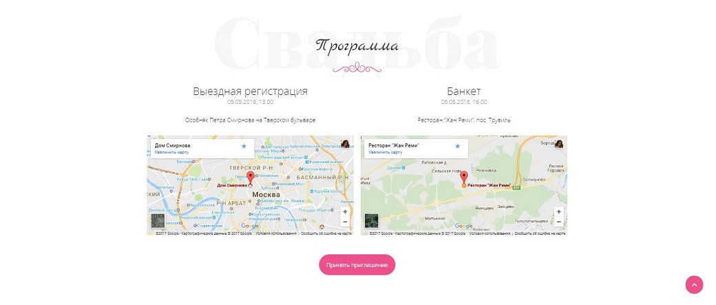 Благодаря встроенным виджетам Google Maps вы сможете показать на карте место проведения торжества. Это удобно как для гостей, которым не придется тратить время на поиск нужного места, так и для вас — вы точно будете уверены, что гости придут в назначенное место в нужное время.