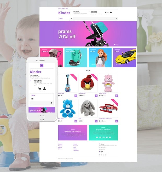 Запустите свой онлайн магазин детских товаров с помощью этого замечательного шаблона с готовым дизайном и встроенной панелью управления MotoCMS. Добавлять товарами, создавать акции со скидками, смотреть статистику, управлять налогами и делать много другое для успешной деятельности вашего проекта легко и просто.
