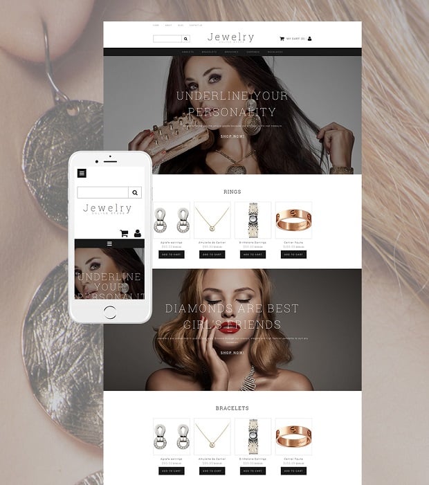 Замечательный шаблон для создания собстсвенного ювелирного бизнеса в Интернете. Минималистичный дизайн поможет вам привлечь новых покупателей, а удобный и легкий фунционал панели управления MotoCMS позволит управлять вашим бизнеса прямо перед экраном вашего монитора или планшета.