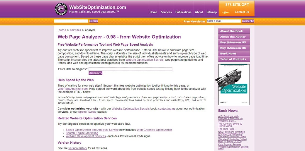 Web Page Analyzer — еще один бесплатный инструмент, с помощью которого проводится проверка скорости загрузки сайта. Инструмент оценивает структуру сайта, его размер и время загрузки страниц. Затем система обрабатывает полученную информацию и выдает рекомендации по улучшению производительности сайта, сформированные с учетом правил и техник WebsiteOptimization.com.