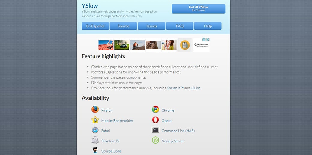 Инструмент Yslow от Yahoo! анализирует производительность сайта, основываясь на 23 критериях Yahoo. Сайты оцениваются по одному из трех стандартных наборов правил. Пользователь также может задать собственный набор правил для проверки производительности сайта. Yslow доступен для Chrome, Firefox, Safari и Opera, а также для PhantomJS и Node.js Server.
