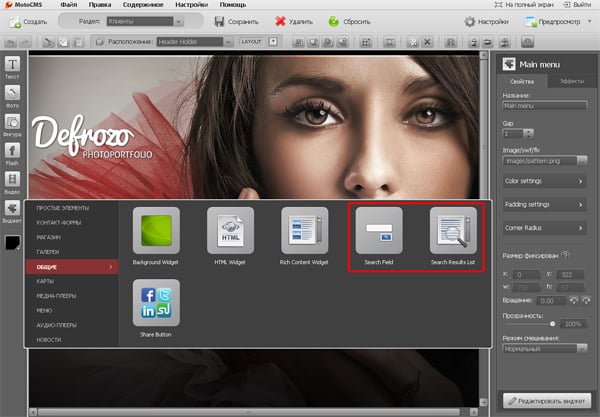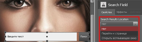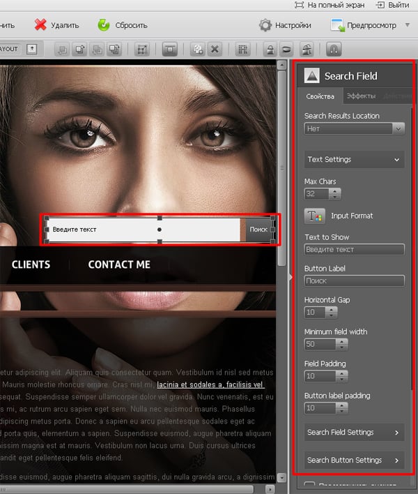 Размещаем поле для ввода поискового запроса (модуль Search Field). В правой панели настраиваем внешний вид поля: вносим необходимый текст, задаем размеры и цвет поля, выбираем цвет для кнопки «Поиск» и др.