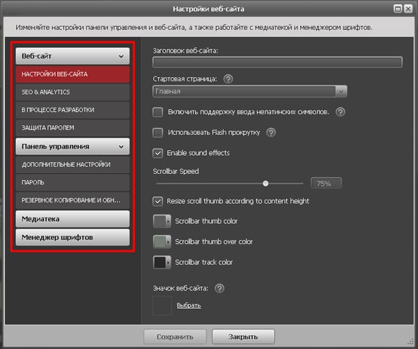 В правой панели есть три раздела с настройками данного модуля.