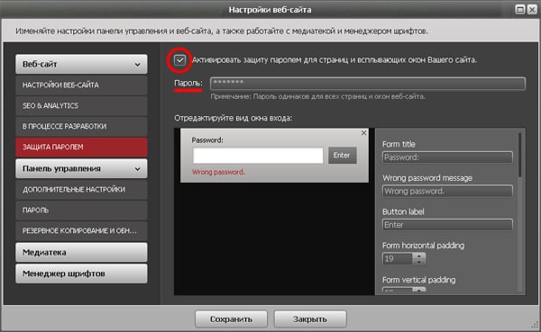 Задаем пароль для всего сайта. Ставим галочку возле опции «Активировать защиту паролем для страниц», внизу появится поле для ввода пароля. Вводим необходимый пароль (максимальное количество 32 символа).
