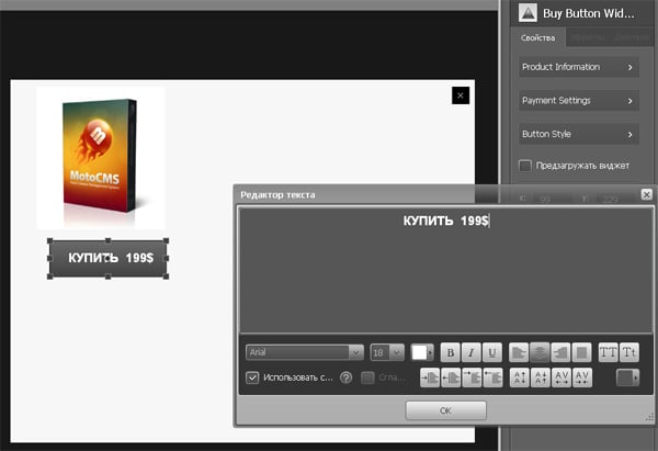 При двойном нажатии на кнопку, откроется текстовый редактор, который позволит Вам размесить на кнопке необходимый текст.