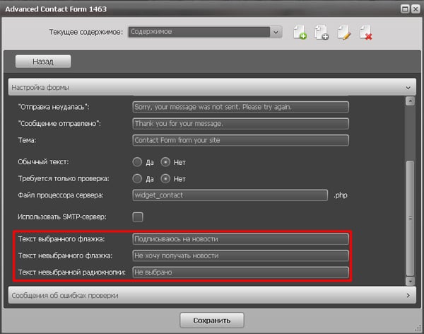 В разделе «Настройки» добавлены новые поля для ввода текста при поставленном или отсутствующем флажке в поле (сheck box), а также при невыбранном значении радиокнопки.