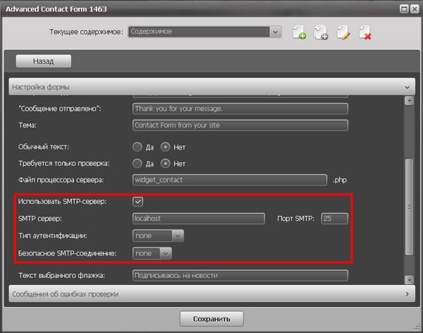 Добавлена настройка формы для работы через SMTP сервер.