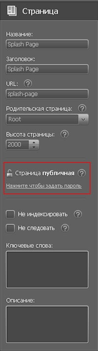 Чтобы активировать защиту страниц Вашего сайта паролем, необходимо сначала открыть страницу, которую Вы хотите защитить. В правой панели теперь располагается надпись «Страница публичная» и «Нажмите, чтобы задать пароль».