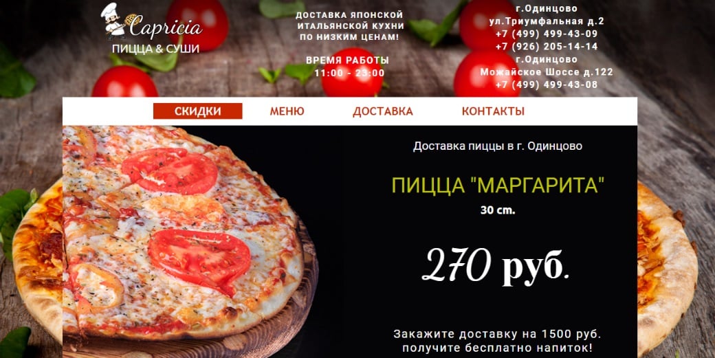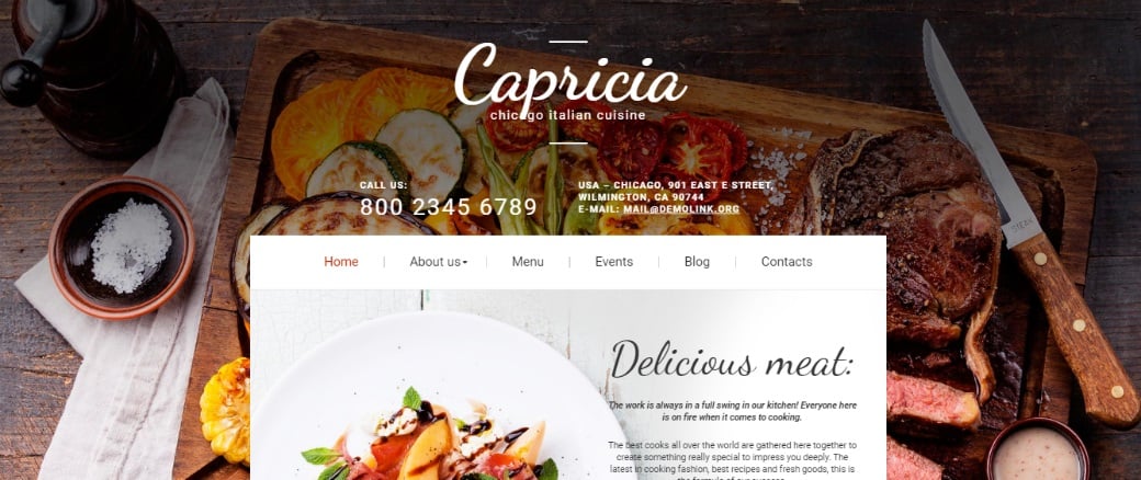 Шаблон, на основе которого создан сайт, настолько подошел именно для этого проекта, что его название даже совпало с названием заведения. Возможно, это стало одной из причин того, что для создания сайта автор выбрал именно шаблон Capricia.