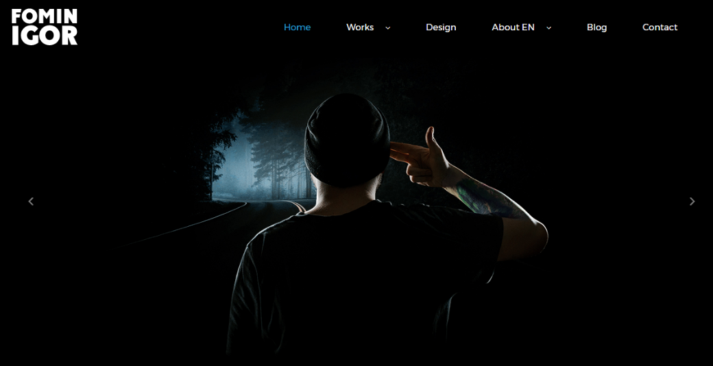 Игорь не стал кардинально менять дизайн шаблона и цветовую схему. На главной странице вместо фонового фото он разместил мини-галерею своих лучших работ, а в верхнем левом углу — свой персональный логотип. Автор сайта решил оставить первоначальный вариант меню и небольшие кнопки социальных сетей в нижней части сайта. Несмотря на минимум изменений в дизайне шаблона, портфолио соответствует стилю работ фотографа и выглядит достаточно оригинально.