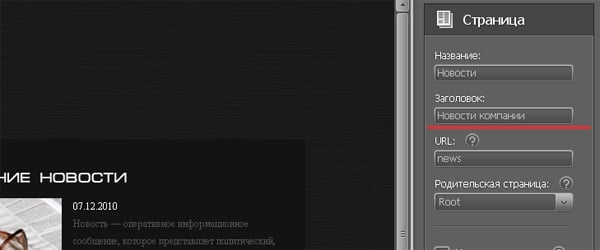 В правой боковой панели мы можем изменить или отредактировать настройки страницы. Заголовок вашей главной страницы может содержать имя компании или отражать сферу деятельности вашего проекта, может содержать и другую важную информацию (например, местоположение или слоган компании). Заголовки других страниц сайта должны отображать конкретное содержание страниц, и также могут содержать название сайта.