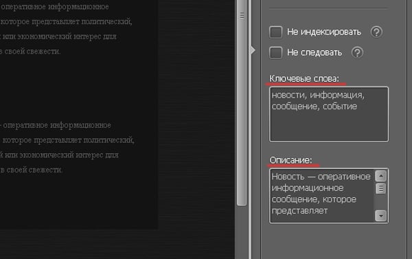 В той же правой боковой панели, немного ниже вы можете внести описание страницы и ключевые слова.