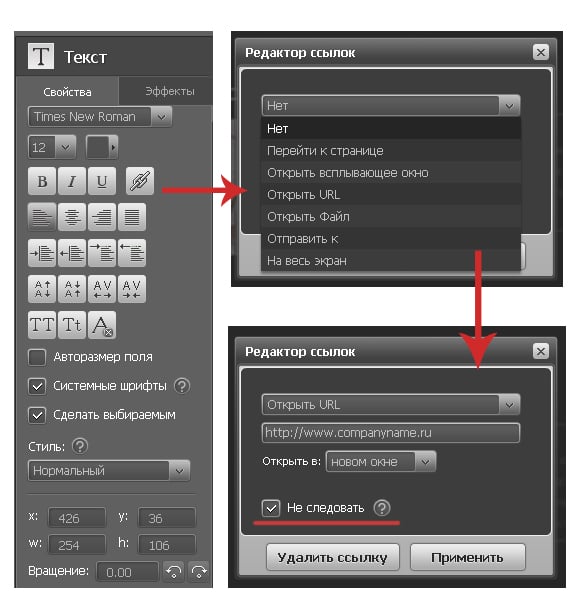 Для создания ссылки просто необходимо выделить текст и перейти в панели текстового редактора к значку ссылки. Появится список вариантов перехода, где вы можете выбрать необходимую позицию. Тут же вы можете поставить галочку «Не следовать», для поискового робота.