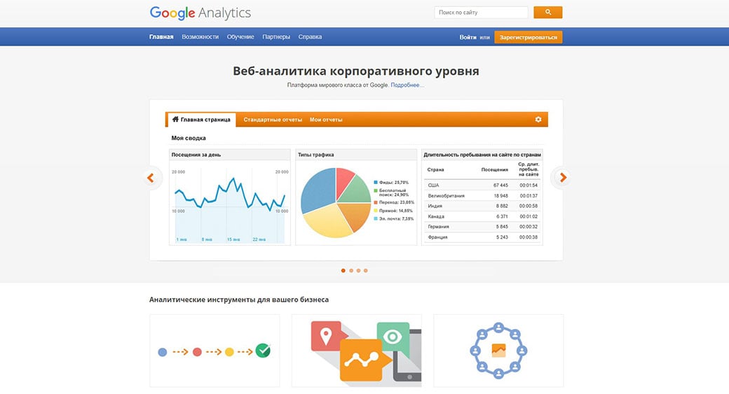 Google Analytics – незаменимый инструмент, который помогает проанализировать SEO продвижение самостоятельно, отследить поведение пользователей на сайте и узнать больше о ваших посетителях. В частности, вы сможете следить за источниками органического и реферального траффика, чтобы узнать, какие ключевые слова люди используют, чтобы найти ваш сайт. Также в аналитике можно просмотреть статистику страниц сайта и выяснить, которые из них чаще всего посещают. На таких страницах уместно будет пометить подписку на рассылку новостей, или же показывать самые популярные продукты.