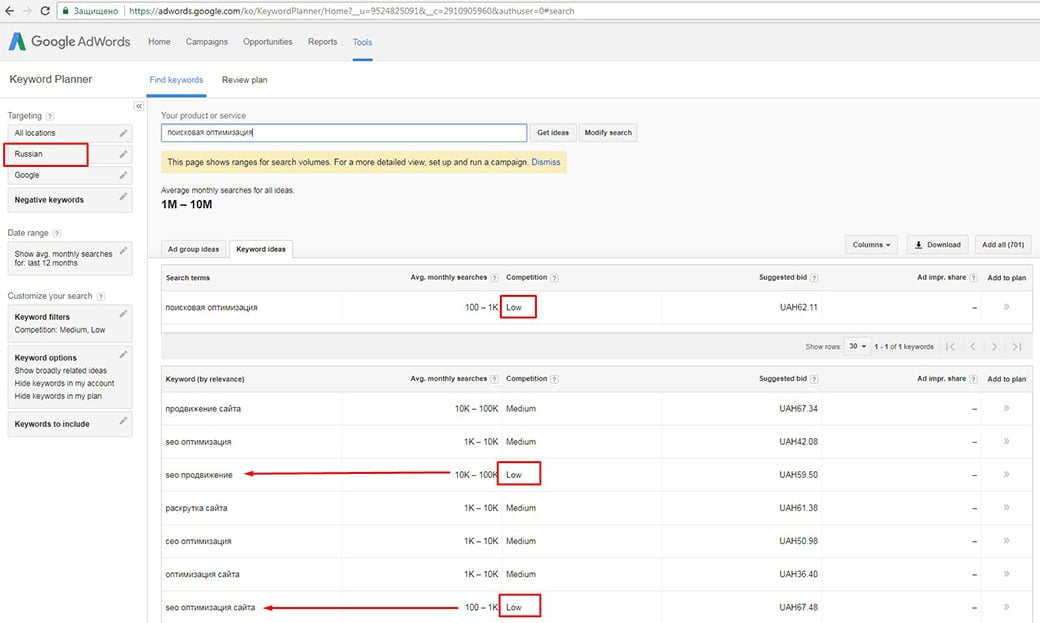 Если вы не знаете, какие ключевые слова использовать когда начинаете SEO продвижение самостоятельно, попробуйте ввести некоторые предварительные идеи в планировщике ключевых слов Google для получения предложений.