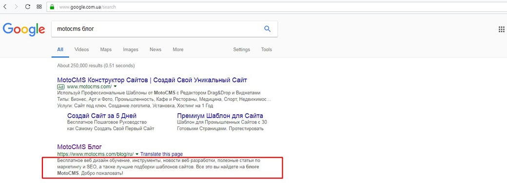 На приведенном выше рисунке показано, как тег названия и мета описание отображаются в результатах поиска Google. Вы можете увидеть, что ключевые слова, которые искали пользователи (в этом случае мы задали ключевую фразу motocms blog) выделены жирным шрифтом как в заголовке (тег title), так и в мета описании. Вот почему вы должны использовать название своей компании и ключевые слова как в названии, так и в мета описании – это помогает пользователям заметить вас в результатах выдачи, когда они ищут по этим запросам.