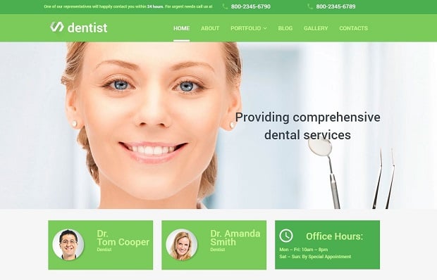 Эта тема также создана в чистом стиле с использованием палитры голубого цвета и акцентом на белое пространство. Лейаут шаблона позволяет позвонить дантисту через Skype благодаря использованию Skype кнопки в шапке сайта.