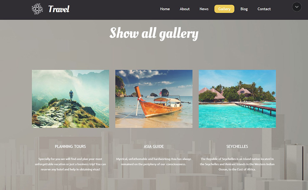 Помимо запоминающейся домашней страницы, вы можете удивить ваших посетителей красивой галереей изображений. Покажите те города и страны, которые туристы смогут посетить, в информативной галерее фотографий. Пусть ваши клиенты окунутся в атмосферу путешествия, просто нажав на фотографии.