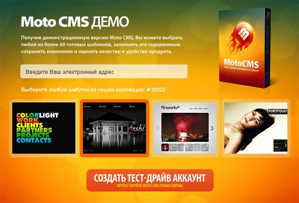 Получить шаблон со встроенной полнофункциональной версией Moto Flash CMS очень легко. На странице Демо необходимо ввести адрес своей электронной почты и выбрать любой шаблон из нашей коллекции. После чего нажимаете кнопку «Создать тест-драйв аккаунт».