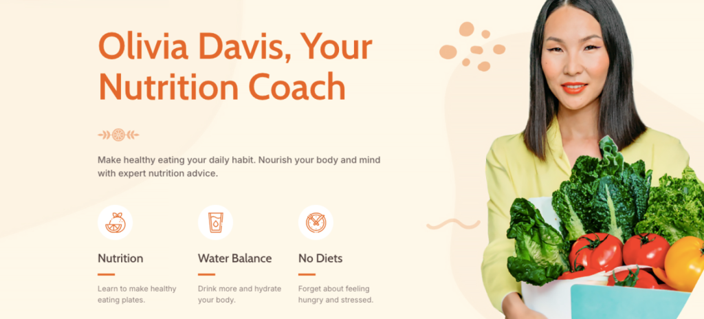 Цветовая палитра сайта от Веблиум отлично подходит для медицинской и нутрициологической тематики. Светло-зелёный и белый создают ощущение чистоты, свежести и доверия — важные ассоциации для сферы здоровья. Яркий лаймовый цвет придаёт энергии и подчеркивает натуральный подход к питанию. Акцентная оранжево-жёлтая кнопка мягко привлекает внимание и побуждает к действию. Визуально сайт выглядит современно, спокойно и профессионально — именно так, как ожидает посетитель, ищущий помощь в вопросах здоровья и питания.