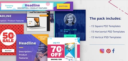 Verbreiten Sie das Wort über Ihr Unternehmen in den beliebtesten sozialen Netzwerken. Mit dem Social Media Paket wird es einfach – es enthält trendige horizontale, vertikale und quadratische Bildvorlagen für Instagram, Pinterest und Facebook,.