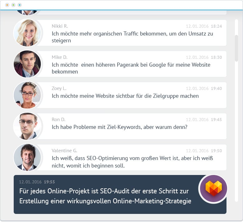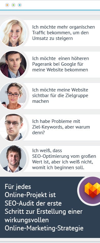 Das SEO-Audit von MotoCMS enthält detaillierte Analyse und nützliche Tipps mit Rücksicht nur auf Ihre Website und den Bereich, in dem Sie arbeiten. Es ermöglicht Ihnen eine wirkungsvolle und nachhaltige SEO-Strategie zur Steigerung der Conversionrate zu wählen.